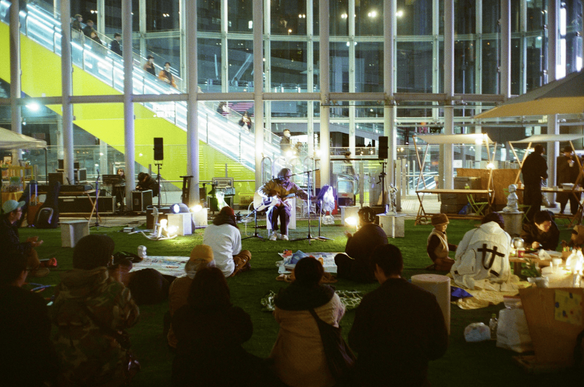 会場には座ることができる場所がたくさんあります。踊ったり、座ったり、寝っ転んだり、いろんな形で音楽と共に居ることができます。